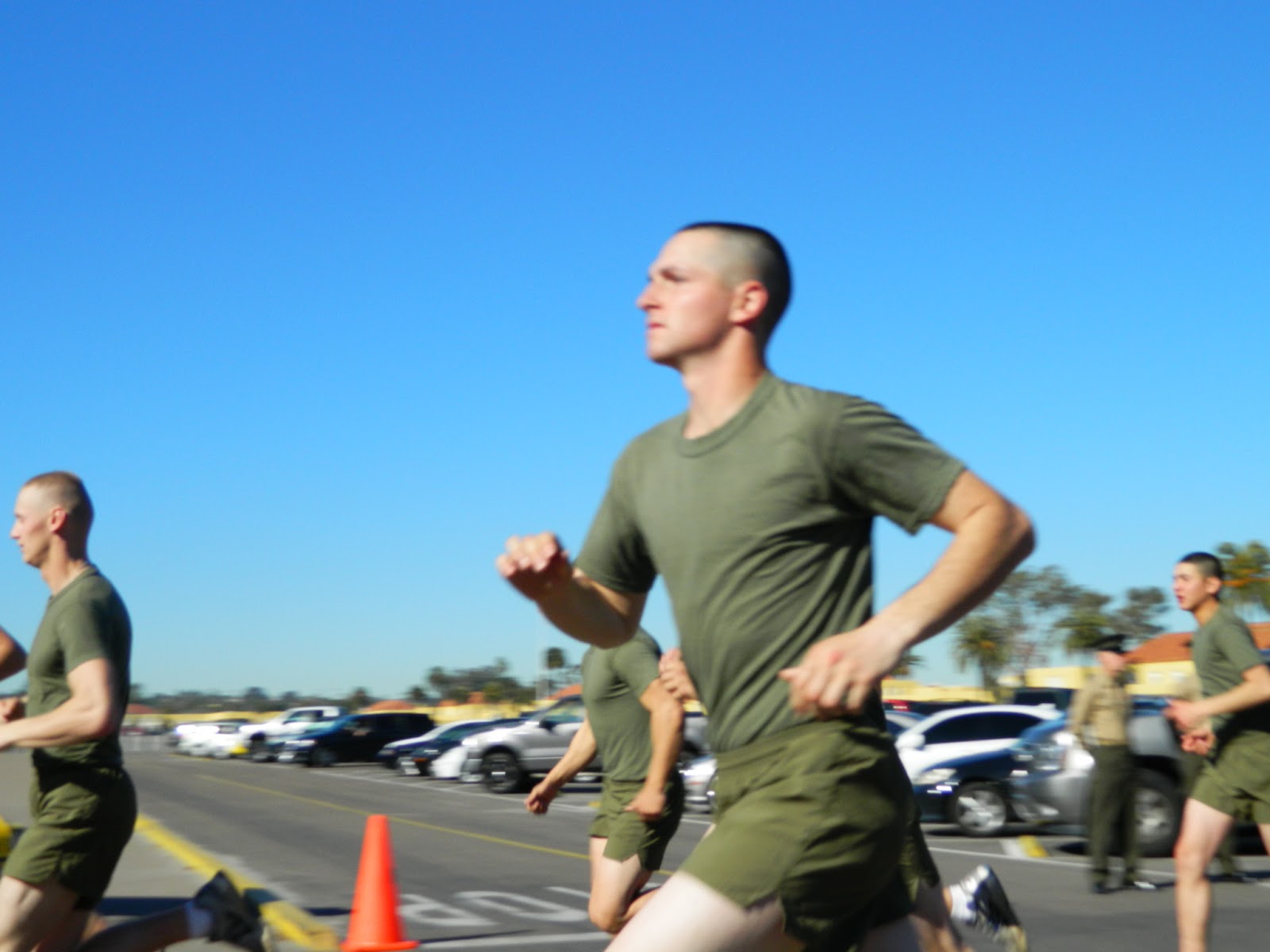 After locating the rest of Derek's family, we headed to the gift shop picking up some tshirts and stickers, and gathered in the courtyard and listened to one of senior drill instructors give the rules of MCRD. EYEBALLS!! CLICK SIR!! Stay off the grass, stay off the parade route. After about an 30 minutes, we made our way to parking lot where the young soldiers came by in their motivational run.
